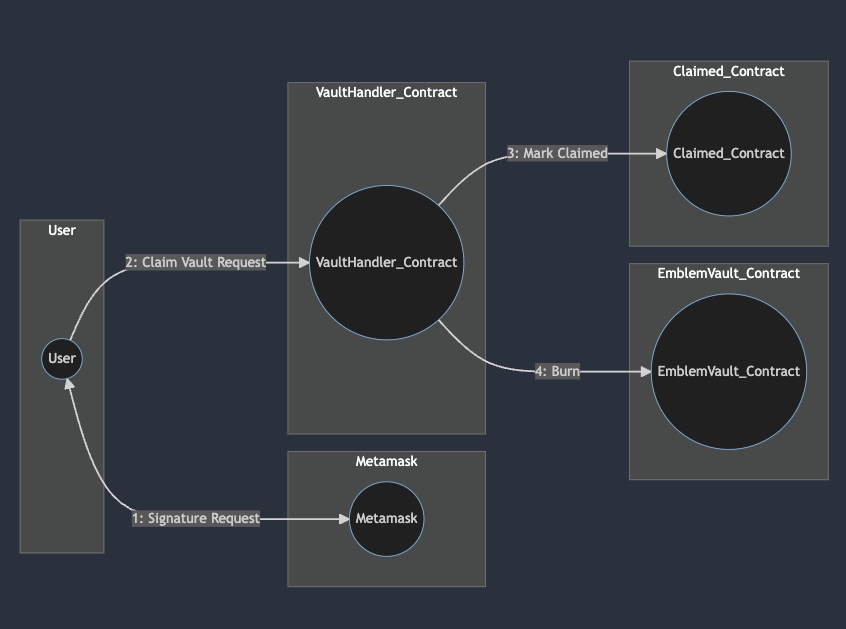 Burn: The VaultHandler_Contract burns the claimed vault token from the EmblemVault_Contract.