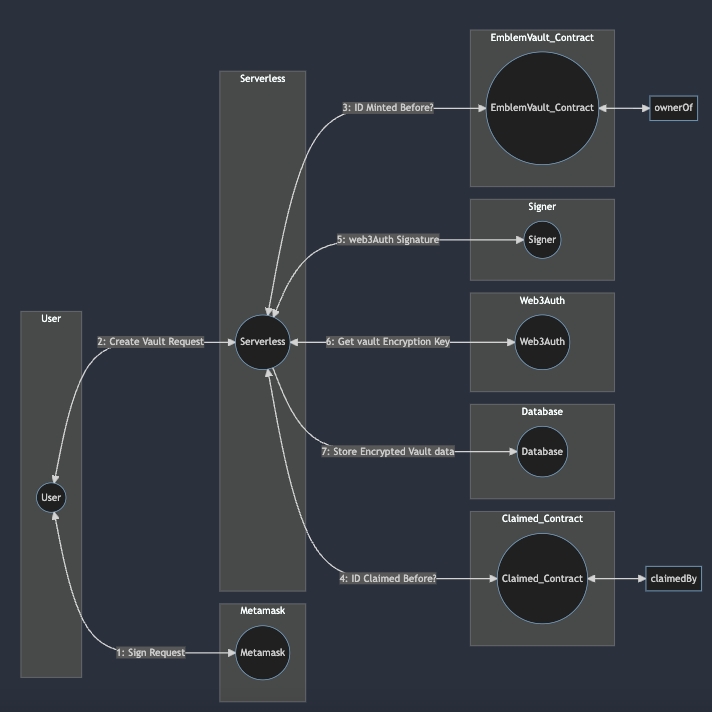In summary, the Emblem Vault Services is a decentralized application that enables users to create, mint, transfer, claim, and access encrypted data vaults on the blockchain. It uses a combination of smart contracts, authentication methods, and serverless functions to ensure the security and privacy of the user's data.