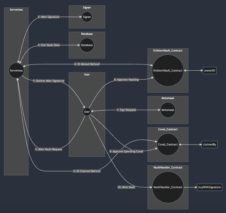 Mint Vault Request: The User sends a request to mint a new vault to the Serverless functions.