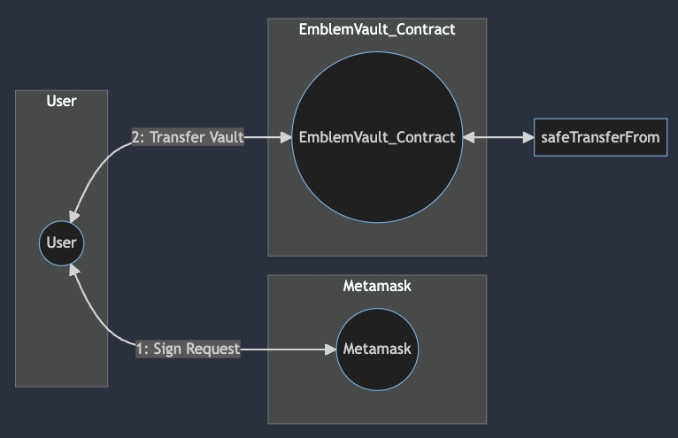Transfer Vault: The User sends a request to transfer the vault's ownership using the EmblemVault_Contract, which then executes the