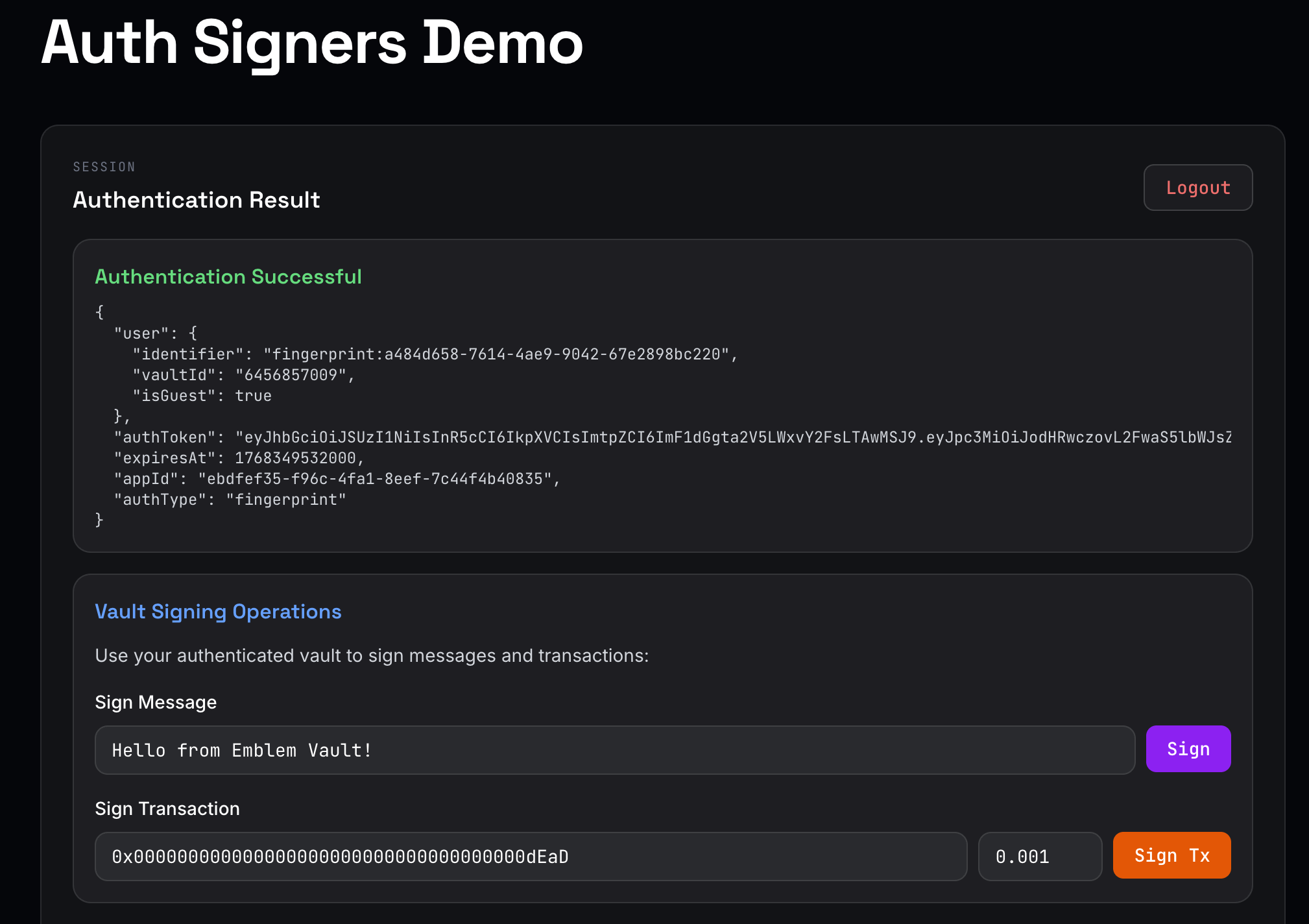 [**Emblem Signers**](https://emblemvault.dev/auth-signers-demo) are a core component of the Emblem Vault platform designed to provide **secure, multi-chain authentication and signing operations** for web3 applications. They serve as the bridge between developers and complex blockchain signing processes across different networks.