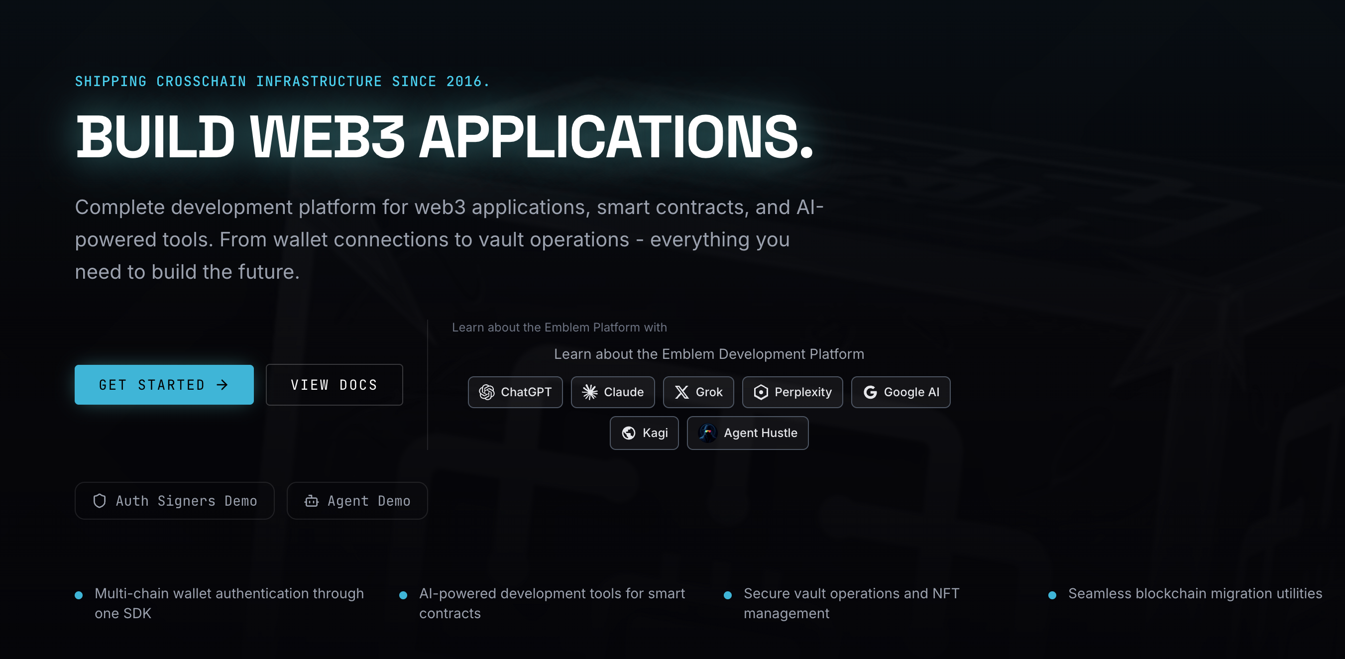 Overall, the Emblem Development Platform combines secure infrastructure (Vault + Auth) with AI productivity boosts (Agent Hustle) to make building multi-chain web3 apps faster and more reliable. It's particularly strong for projects needing robust authentication, asset custody, NFT tools, and AI-enhanced development. For hands-on exploration, start with the quick-start auth docs or SDK installations on the site. If you're a developer, the unified SDK approach could significantly cut integration time compared to piecing together chain-specific libraries.